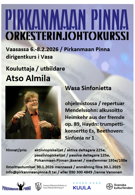 6.-8.2. Kapellimestarikurssi Vaasassa, kouluttajana Atso Almila, orkesterina Wasa Sinfonietta. Ohjelmistossa on: Mendelssohn: alkusoitto Heimkehr aus der fremde op. 89, Haydn: Trumpettikonsertto Es, Beethoven: Sinfonia nr 1. Kurssin hinta on aktiiveilta 225 € (Pirkanmaan Pinnan jäsenet 195 €), passiivit 125 €/100 €. Ilmoittautumiset 19.12.2025 – 30.1.2026.