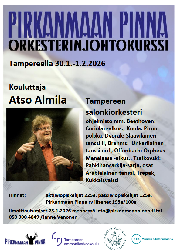 30.1.-1.2. Kapellimestarikurssi Tampereella, kouluttajana Atso Almila, orkesterina Tampereen Salonkiorkesteri. Ohjelmistossa mm. Beethoven: Coriolan-alkusoitto, Dvorak: Slaavilainen tanssi nr 2, Kuula: Pirun polska, Ofenbach: Orfeus Manalassa -alkusoitto, Tsaikovski: Pähkinänsärkijä-sarja, osat Arabialainen tanssi, Trepak ja Kukkaisvalssi. Kurssin hinta on aktiiveilta 225 € (Pirkanmaan Pinnan jäsenet 195 €), passiivit 125 €/100 €. Ilmoittautumiset 15.12.2025 – 23.1.2026.